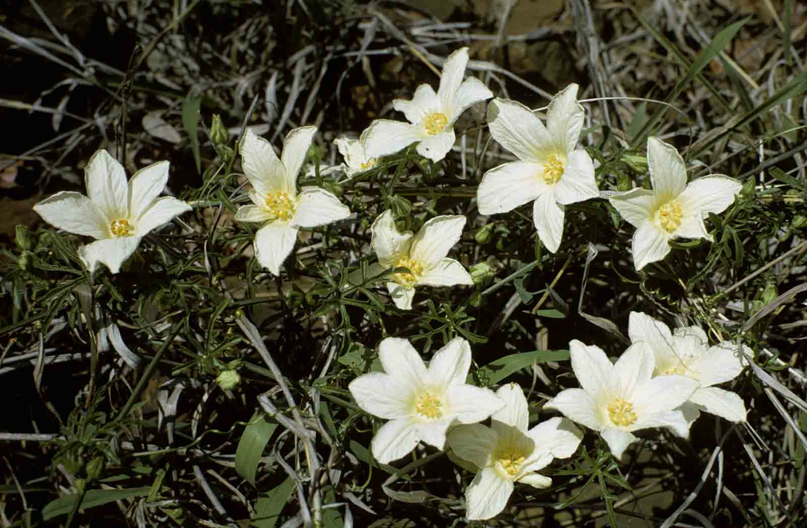 | Image notes: | Flowers 2 inches, cream coloured with conspicuous yellow anthers at bottom of slight cup; petals spreading. Leaves palmately lobed; lobes linear with occasional linear projections. |