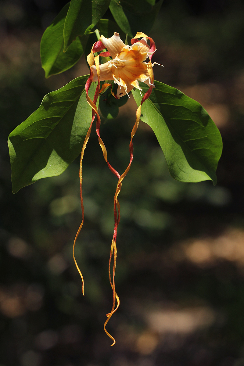 | Notes: | Climber with flowers that are orange, white and pink and have long tassels hanging down. |