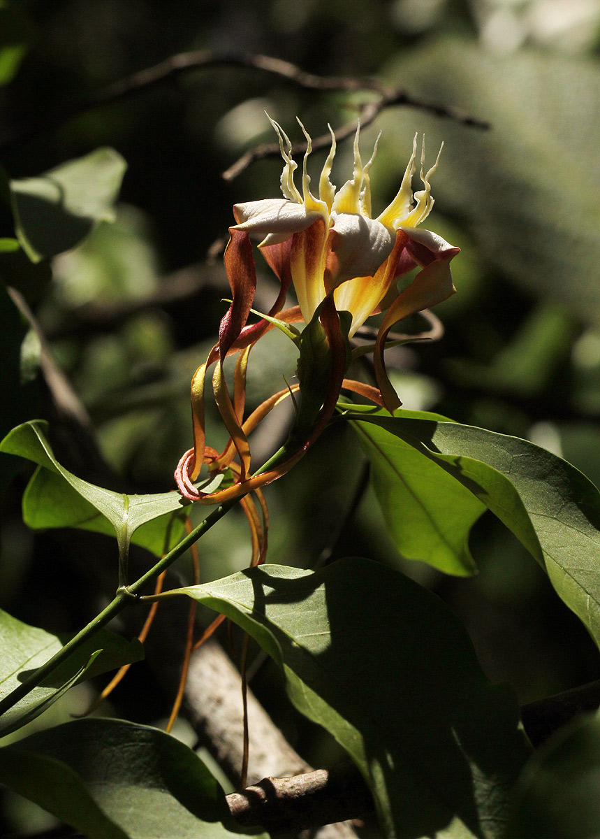 | Notes: | Climber with flowers that are orange, white and pink and have long tassels hanging down. |