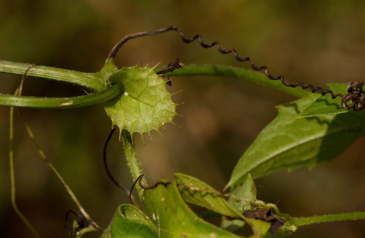 | Image notes: | Vine with uniquely shaped, intricately lobed leaves. Often has curly protrusions. At the node are ""combs"" that look like tiny Venus fly traps. Fruits are round marble-sized berries that are bright red when ripe. Red, orange, and green fruits can occur simultaneously on same plant. |