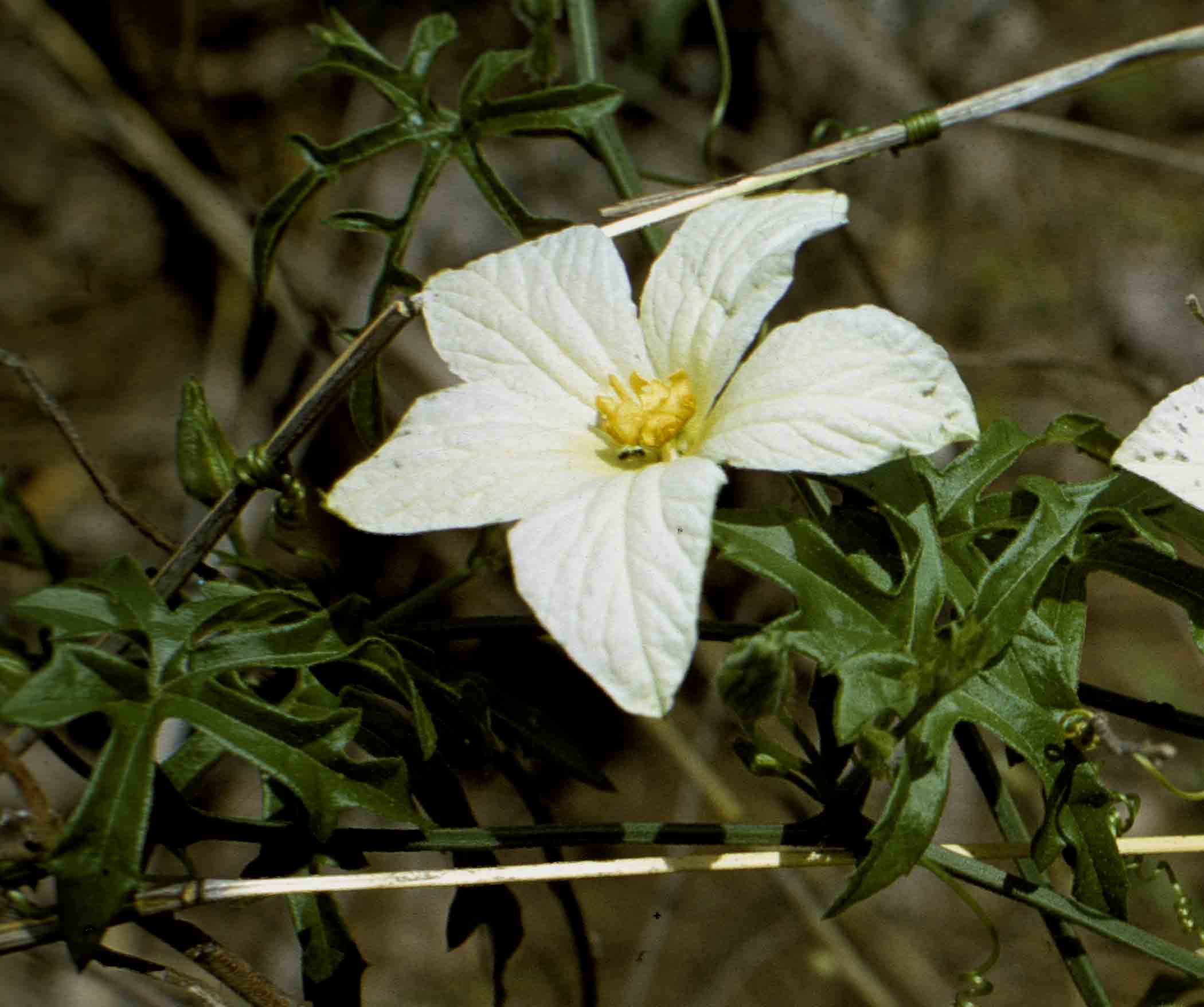 | Image notes: | Flowers 2 inches, cream coloured with conspicuous yellow anthers at bottom of slight cup; petals spreading. Leaves palmately lobed; lobes linear with occasional linear projections. |