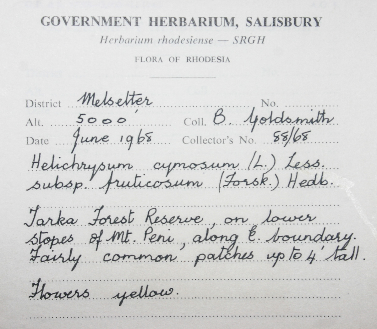 Location: On lower slopes Mt Peni, along eastern boundary Tarka Forest Reserve, Chimanimani.
