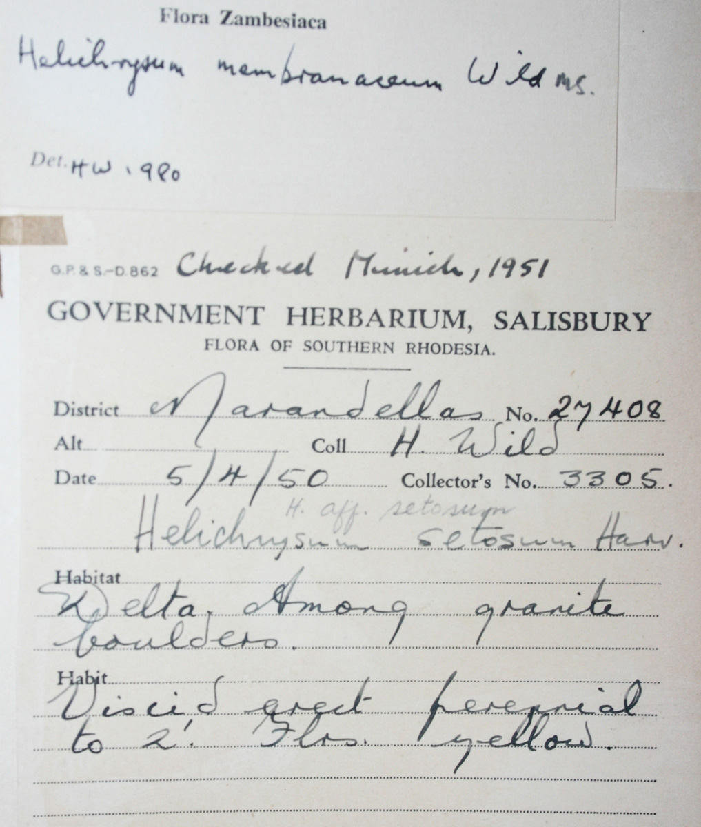 | Notes: | Viscid erect perennial to 2'. Flowers yellow. Cited in Wild 1980: 122, Draft Revision Helichrysum for Flora Zambesiaca. |