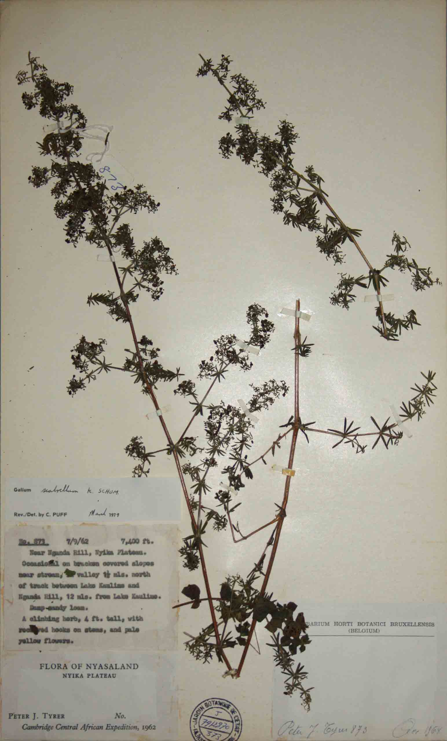 | Notes: | Climbing herb, 4 ft tall with recurved hooks on stems and pale yellow flowers. Collected on the Cambridge Central African Expedition, 1962. |