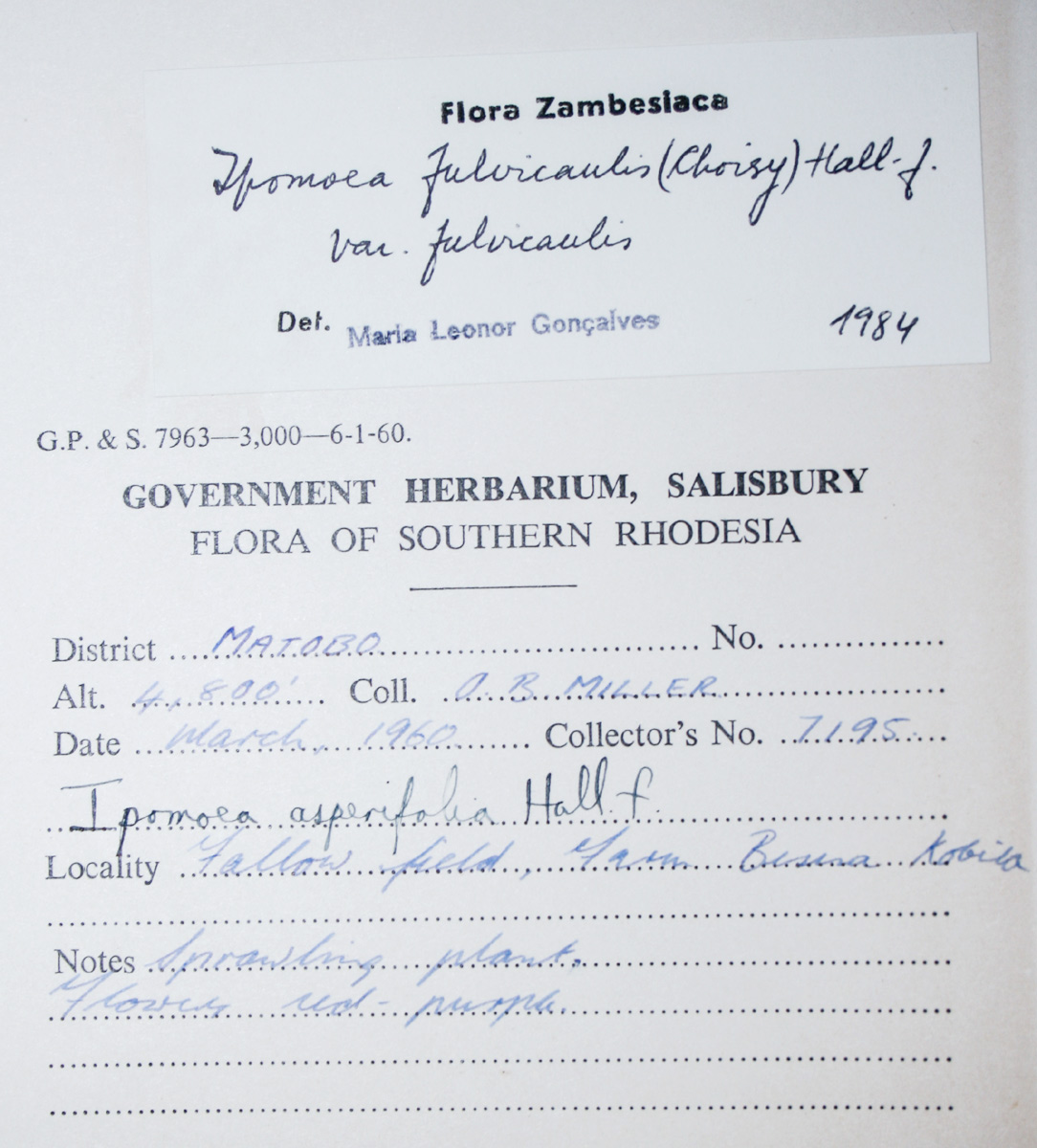 | Notes: | Sprawling plant. Flowers red-purple. [See note 16]. Cited in Flora Zambesiaca volume 8 part 1:69 (1987). |