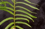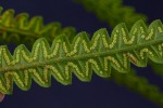 Rhizome widely creeping, up to 6 mm in diameter; rhizome scales sparse, black, narrowly ovate, entire, up to 1.5 mm long. Fronds spaced up to 12 cm apart, erect, not proliferous, herbaceous, in full sun texture stiff, leathery. Stipe up to 93 cm long, pale brown, glabrous to minutely hairy, with a few black scales at the base. Lamina up to 0.8 m long, ovate-lanceolate in outline, 2-pinnatifid, lower pinnae largest or of equal size as those above, only rarely very slightly reduced in size. Pinnae very narrowly oblong, shortly petiolate to sessile, base truncate, incised a third of the way to halfway to the costa; veins 7-15 pairs per lobe, basal pair of veins anastomosing well below the sinus, next pair meeting at the sinus; under surface hairless or set with white hairs, particularly along the costae, costules and veins, with or without pale brown scales on the costae, also sometimes distinct red glands below, upper surface hairless. Rhachis pale brown, hairless to thinly covered with short hairs. Sori round, up to 18 per lobe, typically forming a zigzag pattern along each side of the costa; indusiate small, hairy, often shed early. |