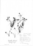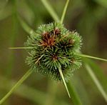Slender annual sedge, 2-30 cm tall, with minute reddish-brown roots. Culms triangular, hairless. Leaves 1-6 cm long, scabrid on the margins and midrib; sheaths dark purple. Inflorescence a dense head of 3-12 crowded spikes, green variegated with reddish-brown. Involucral bracts 2-10, leaf-like, largest 1.5-6 cm long. Glumes 2-3 mm long, reddish-brown with a green mucro, giving the flowerheads a spiny appearance. Nutlet obovate, obscurely triangular, c. 0.6-0.3 mm, with 8-15 rows of tubercles on each side. |