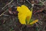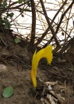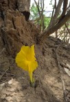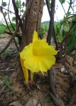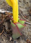 Low perennial herb. Leaves 3-4, somewhat fleshy, flat against the ground in a basal rosette, broadly obovate to almost round, up to c. 7 - 22 cm long, sometimes longer and up to 22 cm wide, hairless above, pubescent below, particularly on the midrib; margin entire, often edged purple-pink. Inflorescence terminal, arising from the centre of the rosette. Flowers showy, yellow, opening one at the time; tube 7-9 cm long; petals narrowly elliptic, 6-8 cm long; labellum 8-11 cm long; anthers 9-13 cm long. |