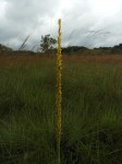 Slender terrestrial herb, up to 1 m tall. Leaves on a separate shoot, 2-3, erect, elliptic, up to 20 × 4 cm, folded along the length. Leaves along the fertile shoot, up to 9 × 3 cm, sheathing. Inflorescence cylindric, 15-30 cm long, dense, 50-200-flowered, bracts 1.5-2.5 cm long, pointed. Flowers c. 1 cm in diameter, bright yellow, often spotted orange. Dorsal sepal obovate, 6-9 mm long with a pendent spur, up to 12 mm long arising from the middle. Lateral sepals spreading, 6-9 mm long. Petals 2-lobed. Lip pendent, linear, 5-9 mm long. |