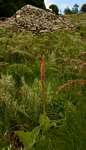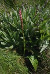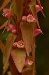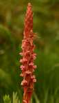 Robust terrestrial herb, 25 - 80 cm. Foliage leaves 2-5 on a separate sterile shoot. Flowering stem with sheathing leaves along the stem. Inflorescence tall and candle-like, densely many-flowered among large, reflexed, pinkish bracts. Flowers pale to deep crimson pink, rarely yellow. Lip convex, forming a hood; spurs 6-17 mm long, parallel to the ovary. |