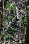 Pendulous epiphyte or occasional lithophyte. The new, slender pseudobulbs arise from the centre of the previous growth, forming long, pendent chains. Leaves 3-4, elliptic-oblong or oblanceolate, glossy green, often with purple veining beneath, 5-15 cm long, arising from the apex of the new growth. Inflorescence terminal, mostly unbranched, fairly densely up to 15-flowered. Flowers green, tinged with brown or reddish-purple, pubescent on the outside, lip pale yellow with a darker centre line. |