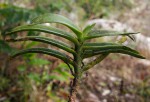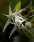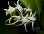 Epiphytic or lithophytic herb. Plants with a robust stem, up to 30 long, often forming large clumps. Leaves, leathery or somewhat fleshy, more or less flat and not folded along the length, linear, oblong or elliptic, up to 20 × 2.5 cm. Inflorescences 8-18 cm long, c. 10-flowered. Flowers star-shaped, sweetly scented, 2.5-3 cm in diameter, white, turning apricot with age. Sepals, petals and lip similar, lanceolate, acuminate, recurved at the apex. Spur 3-6 cm long, greenish, curved. |