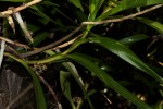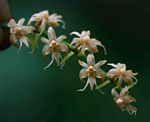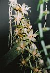 Epiphytic or lithophytic herbs, sometimes growing in abundance, covering entire rocks or trees. Stems long and straggling, up to 1.5 m. Leaves borne on the apical part of the stem, linear, unequally lobed at the apex, up to 18 cm. Inflorescences mostly along the older parts of the stem, stiffly pointing downwards, c.10-flowered. Flowers straw-coloured. Lip 3-lobed; side lobes filiform mostly entire. |