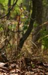 Saprophytic terrestrial, up to 70 cm. Stems purple-brown when young, turning greyish with age. Leaves 3, purple-brown, bract-like. Inflorescence lax, up to 20-flowered. Sepals linear, purple-brown, semi-erect, reflexed at the tips. Petals yellowish-purple, overlying the column but curled back at the tips. Lip 3-lobed, pointed, densely papillose, white, yellowish near the base. Spur up to 5 mm, slightly bulbous near the apex. |