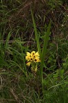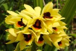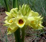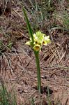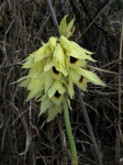 Robust terrestrial, up to 70 cm. Leaves long and narrow, usually just developing or absent at the time of flowering. Inflorescence dense and short with many flowers up to 7 cm in diameter, lemon yellow with a deep yellow-orange lip and a purple-brown throat. |