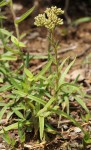 Erect perennial herb, up to 90 cm tall with one to numerous stems growing from a tuberous root. Basal leaves rosulate, lanceolate, up to 16 cm long, sessile and shortly sheathing at the base, e green, sometimes with purple markings or purple undersides,usually dried or gone at the time of flowering. Stems fleshy, covered in appressed whitish, hair-like papillae. Stem leaves similar but much shorter and normally not sheathing at the base. Inflorescence a densely-flowered, flat-topped branched head up to 20 cm in diameter. Flowers white, greenish-white, flushed with pink or bright to deep red. |