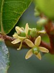 Strong robust liane. The young branches are covered with sharp, hooked thorns. In older branches these form thickened knobs, which still maintain the hooks. Leaves 3-foliolate; leaflets elliptic to obovate, shiny green, paler below, covered with translucent gland-dots, with a strong citrus smell when crushed. Flowers in axillary and terminal clusters or branched inflorescences, cream to pale greenish-yellow. Fruit small, citrus-like, orange when ripe. |