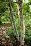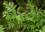 Deciduous tree. Bark smooth, distinctly pale bluish, peeling in papery translucent straw-coloured strips; young branches greyish, velvety, not spine-tipped. Leaves clustered, imparipinnate with 2-4 pairs of leaflets, more rarely 3-foliolate, both types together on the same tree; leaflets oblong-elliptic, up to 8 × 4.5 cm, greyish velvety below, hairless or with a few scattered hairs on the veins and midrib above; margin scalloped or finely toothed. Flowers small, greenish-yellow, solitary or in few-flowered clusters on the spur-branchlets, appearing with the very young leaves. Calyx and stalks densely covered in greyish hairs. Fruit subspherical, c. 1.5 cm in diameter, somewhat flattened, hairless. Pseudaril covering about 3/4 of the seed. |