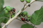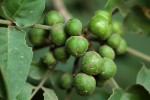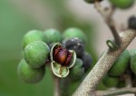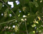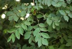 Scrambling shrub or small tree. Leaves imparipinnate with 4-6 pairs of leaflets and a terminal leaflet; leaflets opposite or alternate, ovate to elliptic, mostly c. 7 × 3 cm, rather dull green and finely velvety above, more densely so below, base asymmetric; margins entire. Flowers in short and dense, stalked axillary heads, white to yellowish, small. Fruit a spherical woody capsule, pale green, c. 1.5 cm in diameter, splitting into 3 valves, revealing black seeds, in a dull dark red aril. |