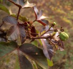 Multi-stemmed shrub. Stems and branches hollow, purple, covered in stalked glands (image 3). Leaves crowded near the ends of branches, palmately 3-5-lobed, dark purple when young, turning olive-green with age, margins and petioles with hair-like stalked glands. Flowers in terminal clusters, deep red with a yellow centre. Fruit a 3-lobed capsule. |