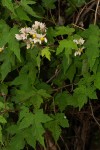 Slender bush, occasionally scrambling, up to 3 m. Leaves 3-13 cm long, 3-7-lobed wth a cordate base and 5-7-veined from the base, lobed half to three quarters, middle lobe longest, with both simple and stellate hairs on both surfaces; margin irregularly crenate-dentate; petiole up to 8 cm long, pubescent; stipules up to 8 mm long, setaceous. Inflorescences in extra-axillary and leaf-opposed, 6-20-flowered umbels; peduncles up to 8 cm long, pubescent. Flowers white, sometimes tinged purplish with petals about as long as sepals; stamens numerous (c. 50), yellow. Capsule ellipsoid, 2-2.5 cm long including bristles, 4-5-valved, covered in bristles that stick to clothing and animal fur. |