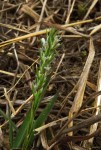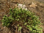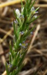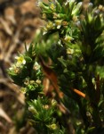 Small shrubby herb, 15–40 cm high, with numerous erect branches growing from a woody rootstock. Leaves alternate, sessile, crowded on the upper part of the branches, elliptic to narrowly ovate, 6–16 mm long, rigid, somewhat wrinkled, more or less densely silky hairy beneath, only sparsely so above. Inflorescences terminal or axillary in clusters of 1–4 flowers, sessile or very shortly stalked. Bracts 2–4, leaf-like, 7–8 mm long, silky hairy. Flowers 4-merous, pale blue, whitish or yellow. Calyx tube 4–8 mm long, densely hairy; lobes ovate, 2–2.5 mm long, hairy outside. Petals 8, linear, membranous, less than 1 mm long. |
