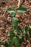 Shrub or small tree. Leaves opposite, lanceolate, elliptic, ovate to obovate, hairless, shiny above, duller beneath; domatia present; margin slightly thickened; petiole 3-7 mm long. Inflorescence consisting of sessile axillary clusters of sweetly scented flowers. Calyx 2.5-3.5 mm long, campanulate with 4 lobes in slightly unequal pairs. Corolla white or pale yellow with 4 lobes almost free to the base; lobes hooded at the apex. Fruit c. 1.5 cm long, an ellipsoid drupe, purple-black when ripe. |
