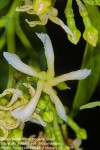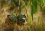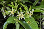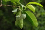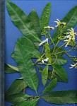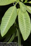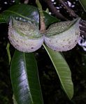 Shrub or small tree. All parts with milky latex. Bark pale brown, corky, deeply fissured. Leaves opposite, elliptic, leathery, glossy dark green, usually hairless on both surfaces with 12-23 lateral veins on each side of the midrib, straight but curving up near the margin. Flowers in lax corymbs; corolla white, creamy or pale yellow, sweetly scented. Fruits in spreading pairs of obliquely ovoid, beaked pods, each up to 8 cm, glaucous or green, covered in pale brown warts. |