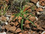 Erect perennial herb, growing from an ovoid to subspherical tuber, up to 10 cm in diameter. Stems single to few, erect, often twining terminally, up to 75 cm long, brownish. Leaves opposite, sessile, 12-15 cm long, linear to very narrowly ovate-lanceolate, green and finely velvety above, paler below; midrib whitish. Flowers in 5-10-flowered axillary and terminal clusters. Corolla densely finely velvety outside; lobes often strongly reflexed, up to 6 × 3 mm, oblong-ovate to triangular, green, often with a violet base, green-brown, maroon-brown or dull violet-red. Corona whitish to purple; lobes 3-segmented; central segment 5-6 mm long, much larger than lateral. Fruit paired, erect follicles, cylindrical-ovoid, c. 100 × 4 mm. |