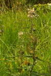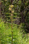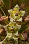 Robust erect perennial herb, up to 1.5 m tall. Stems hairy with milky sap. Leaves opposite, lanceolate-elliptic, 8-27 cm long, hairy; margin often reddish-purple rimmed, very wavy. Flowers in dense axillary umbel-like inflorescences, creamy-green to yellowish, often tinged purple-brown. Corolla lobes erect with recurved tips, densely fringed with white hairs. Fruit single or paired follicles, up to 10 × 5 cm, inflated, covered in curled bristly hairs. |