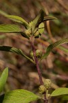 Shrub. Leaves opposite or in whorls of 3, elliptic, venation distinctly sunken above, both sides hairy, margins dentate. Flowers in dense, round, small, stalked clusters, creamy-white. |