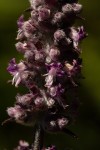 Perennial herb up to 6o cm tall, not noticeably aromatic. Stems 4-angled, densely whitish hairy, particularly towards the top and inflorescence. Leaves opposite, (sub)sessile, ascending to more or less pressed against the stem, elliptic, 3-6 cm long, sparsely hairy; margin serrate, rolled under. Inflorescence more or less densely flowered, spike-like but often with 2 shorter branches below the base of the central inflorescence. Flowers pink or mauve, densely whitish hairy. |