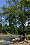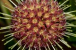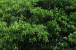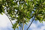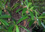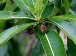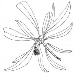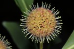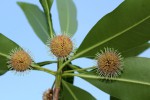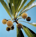 Medium to large evergreen tree. Leaves in whorls of 3 to 5 near the ends of branches, lanceolate to narrowly elliptic, leathery, dark green with the midrib yellow, raised conspicuously. Flowers in small axillary spherical heads of numerous minute, yellowish flowers. Fruits a small ball of capsules. |