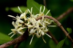 Deciduous, often multi-stemmed, shrub, 0.5–3 m tall; lateral branches reduced to dwarf shoots called brachyblasts up to 1 cm long. Leaves along young stems linear-oblong, those clustered on brachyblasts narrowly to broadly elliptic, 1.4–4.2 cm long, papery, finely pubescent beneath, more densely on the veins, domatia present as small hairy tufts; petiole 2–5 mm long, stipules 2–3 mm long, triangular-acuminate. Inflorescences sessile on the brachyblasts in dense, 3–8-flowered clusters. Corolla creamy-white, hairy at throat; lobes narrowly oblong, 3–4 mm long, obtuse. Style pubescent. Fruit globose, c. 5 mm in diameter, crowned by persistent calyx rim, black when dry. |