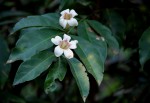 Shrub or small tree, to 12 m. Leaves opposite, narrowly elliptic to oblanceolate, glossy green, glabrous; margin wavy; domatia present but small. Flowers strongly and sweetly scented, usually solitary. Calyx glabrous to glabrescent. Corolla white with reddish-purple markings. Fruit 2-4 cm, spherical, blackish when ripe. |
