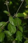 Shrub or small tree. Leaves opposite, mostly hairless, elliptic to oblanceolate with a distinct driptip. The veining is prominent below, veins and petiole often pinkish red, young leaves pink. Flowers in dense axillary clusters, bell-shaped, creamy white, mottled with pink; corolla with silky hairs on the outside. Fruit fleshy, brown to black when ripe, remains of the old calyx teeth persistent. |