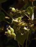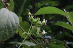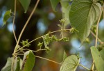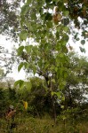 Vigorous climber with an unpleasant smell. Leaves opposite or in whorls of 3. elliptic to ovate, grey-green, densely velvety, particularly below; petiole up to 15 cm long, velvety. Flowers in axillary many flowered heads on long peduncles, whitish to pale creamy-yellow. Fruit compressed ellipsoid, c. 12 mm long, yellowish to brownish, crowned by the persistent calyx lobes. |