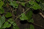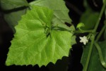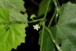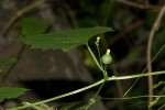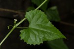 Slender climber with mostly hairless stems and simple tendrils. Leaves unlobed, ovate, 2-7.5 cm long, broadly cordate at the base, finely punctate above, hairless except for a few setulae on the veins beneath; margin with prominent sinuate teeth; petiole 0.7- 5.2 cm long, mostly hairless. Flowers unisexual on the same plant, small, creamy-white; petals 1.5-2.5 mm long. Male flowers solitary or in axillary clusters of up to 10 flowers, sometimes with 1-2 female flowers. Female flowers solitary or as part of a mostly male cluster. Fruit globose, 8-10 mm in diameter, hairless, on pedicels 4-14 mm long. |