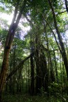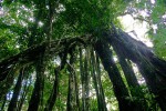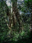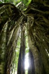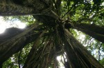 Large evergreen tree, up to 40 m high, starting as a hemi-epiphytic strangler but eventually free-standing. Stem often with numerous aerial roots eventually forming supporting pillars. Bark fairly smooth, pale to dark grey, sometimes mottled. Leaves thinly leathery and stiff, elliptic or slightly obovate, 5-12 cm long, dull glossy dark-green above, paler beneath, hairless on both surfaces; lateral veins and midrib raised and yellowish above not raised beneath, finer veins indistinct; apex rounded or finely pointed; margin entire; petiole 14-32 mm long, hairless. Fruit sessile, singly or in pairs in the leaf axils, sometimes below the current leaves, mostly globose, 10-15 mm in diameter, hairless, yellowish-green with small warts, bright red or pinkish when ripe; ostiole not or slightly raised. |