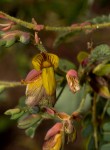 Shrub 1.5–4.5 m tall; bark rough, greyish- to reddish-brown, sometimes lenticellate, appearing jointed at the nodes due to the scars formed by the deciduous stipules; young shoots densely covered with glandular tubercular-based hairs. Leaves 10–28-foliolate, up to 9 cm long; leaflets oblong-elliptic to narrowly oblong, 2.5–17 mm long, rounded to slightly emarginate and very shortly mucronulate at the apex, asymmetric at the base, entire; venation visible beneath; stipules conspicuous, 5–25 × 2.5–8 mm, oblong to lanceolate, deciduous or a few sometimes persistent, hairless or pubescent. Inflorescences in axillary racemes, 3–7 cm long, hairy like the stems, sometimes together appearing as a terminal inflorescence; peduncles 1.3–2 cm long; pedicels 5–6 mm long. Calyx reddish, hairless, 2-lipped; one 2-fid, the other 3-fid. Standard pale yellow, sometimes veined lilac, or crimson, rounded oblong, 10–11 mm long; wings and keel yellow, the latter much exceeding the standard. Fruit of 1–2 semicircular articles, 10–20 × 6–10 mm, compressed, hairless or with a few obscure hairs on the rounded margin. |